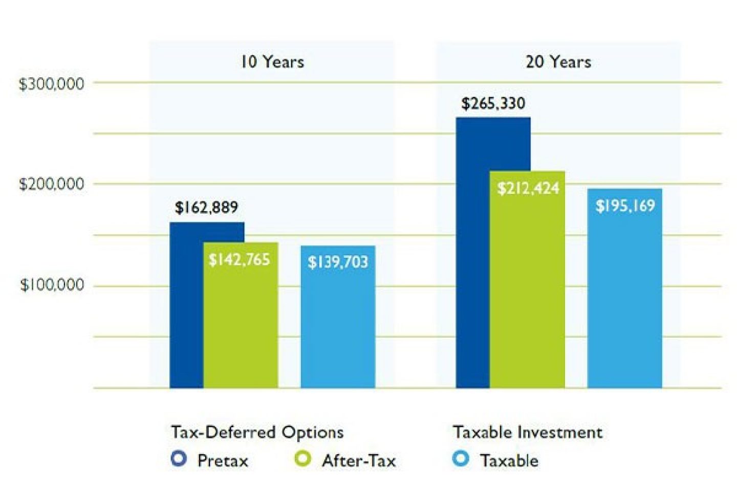 Tax-deferral assumptions: Hypothetical example for illustrative purposes only. Assumes a nonqualified contract with a cost basis of $100,000. The full amount after 20 years before taxes equals the purchase payments plus interest, $265,330. The amount withdrawn after taxes are paid is calculated by taking the full amount and subtracting the cost basis; it is then multiplied by 0.68 (32% ordinary income-tax rate) and adding back in the cost basis, for a total of $212,424 after taxes.
