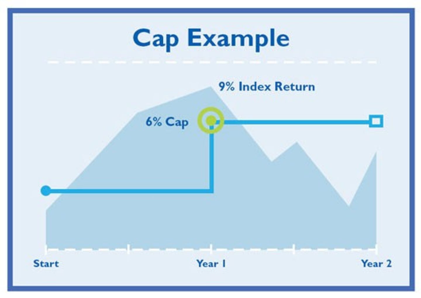Some fixed indexed annuities have a maximum rate, or cap. For example, if you have a cap of 6% and the market had a return of 9%, your contract would be credited 6%.